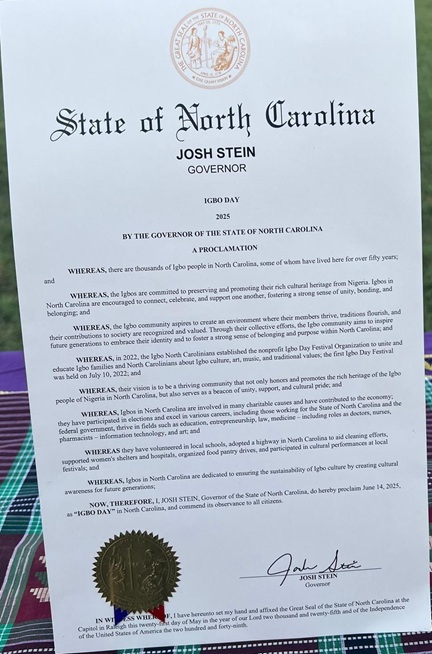 “Igbos have lived in North Carolina for over 50 years, contributing significantly to the state’s economy, public service, and civic life,” Stein said. He noted that members of the community have excelled in education, law, medicine, entrepreneurship, information technology, and have held key positions in state and federal government.